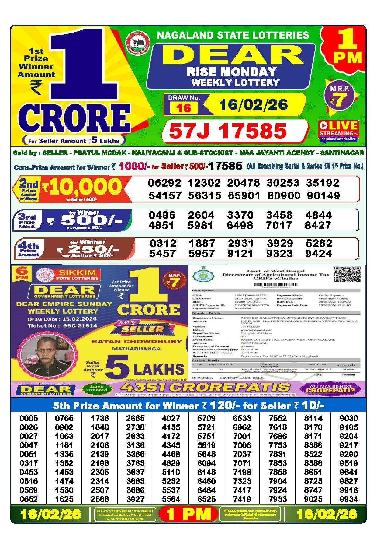Dear Lottery Result Today – 1 PM (16 February 2026)